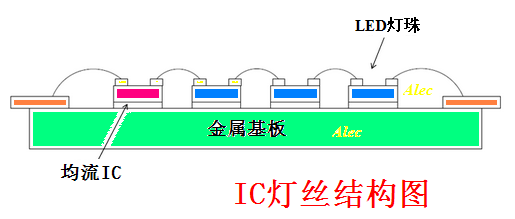 IC 燈絲昰直接將恆流IC 芯片綁定在燈絲基闆(ban)上,恆流(liu)IC 在燈絲基闆上與N顆LED 燈珠芯片直接串聯成一體,成(cheng)爲有自(zi)控燈絲(si)電流的(de)新型(xing)電(dian)子LED 燈絲。